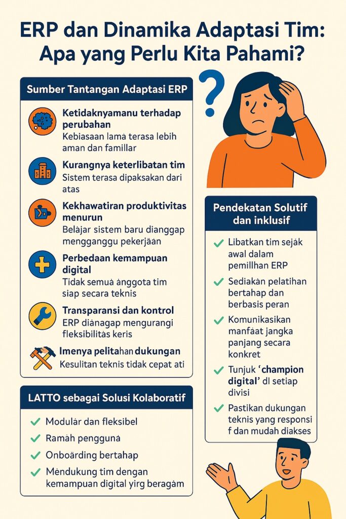 Infografik ini mengajak kita untuk memahami mengapa resistensi terhadap ERP sering terjadi, dan bagaimana pendekatan yang inklusif dan solutif bisa menjadi jembatan menuju transformasi yang sukses.